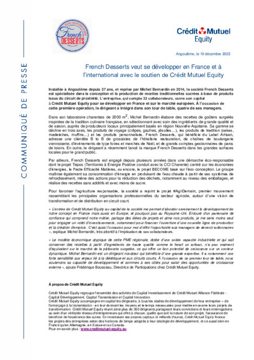 Installée à Angoulême depuis 37 ans, et reprise par Michel Bernardin en 2014, la société French Desserts est spécialisée dans la conception et la production de recettes traditionnelles sucrées à base de produits issus du circuit de proximité. L’entreprise, qui compte 32 collaborateurs, ouvre son capital à Crédit Mutuel Equity pour se développer en France et sur le marché européen.