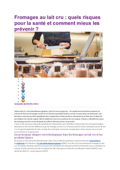 Métiers 08 avril 2022 - 00:14 L’Anses publie aujourd’hui le résultat de son expertise sur les risques pour la santé liés à la consommation de fromages au lait cru. PDF (266 Ko) Télécharger