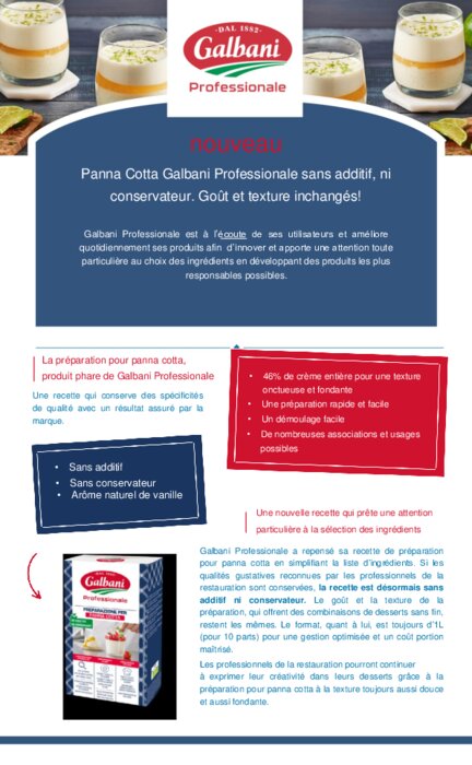 Fournisseurs 11 octobre 2022 - 11:32 Galbani Professionale est à l’écoute de ses utilisateurs et améliore quotidiennement ses produits afin d’innover et apporte une attention toute particulière au choix des ingrédients en développant des produits les plus responsables possibles. PDF (543 Ko) Télécharger