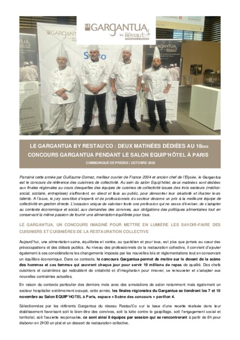 A l'occasion du salon Equip'Hôtel, le concours Gargantua fait son grand retour avec deux matinées dédiées aux finales régionales au cours desquelles des équipes de cuisines de collectivité issues des trois secteurs (médico-social, scolaire, entreprises) s’affronteront, en direct et face au public, pour démontrer leur créativité et illustrer leurs talent.