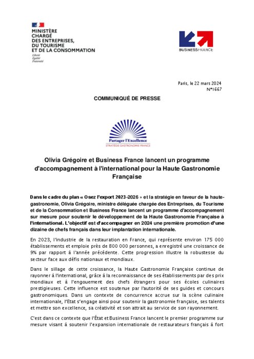 Le gouvernement a dévoilé vendredi un dispositif d'accompagnement de chefs de la haute gastronomie pour aider à leur implantation dans quatre pays du Moyen-Orient et d'Asie, dont l'Arabie Saoudite et la Corée du sud, choisis pour leur "potentiel".