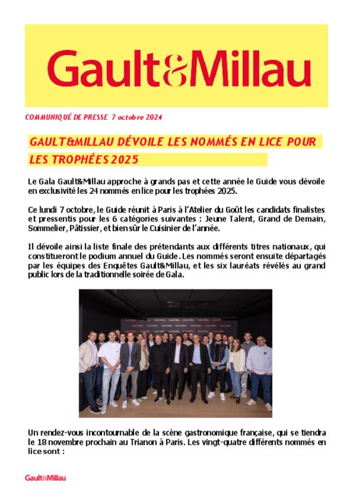 Métiers 08 octobre 2024 - 11:16 Ce lundi 7 octobre, le Guide réunit à Paris à l’Atelier du Goût les candidats finalistes et pressentis pour les 6 catégories suivantes : Jeune Talent, Grand de Demain, Sommelier, Pâtissier, et bien sûr le Cuisinier de l’année. PDF (979 Ko) Télécharger
