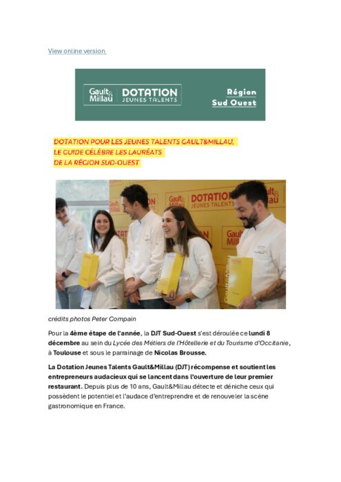 Axelle Mazel et Matthieu Bidault, formés en salle et en cuisine à l’Institut Paul Bocuse et passés par plusieurs maisons de renom, ont déjà occupé des postes clés, de commis à chef de partie. Lauréats de la Dotation Gault&Millau, ils préparent l’ouverture de leur table Mazelia en 2026 à Montbazens, où ils proposeront un menu quotidien le midi et un menu dégustation le soir.