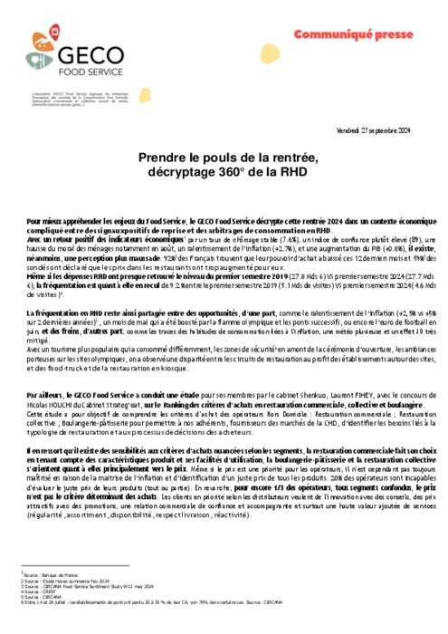 Avec un retour positif des indicateurs économiques par un taux de chômage stable (7.6%), un indice de confiance plutôt élevé (89), une hausse du moral des ménages notamment en août, un ralentissement de l’inflation (+2.7%), et une augmentation du PIB (+0.8%), il existe, néanmoins, une perception plus maussade. 92%[2] des Français trouvent que leur pouvoir d’achat a baissé ces 12 derniers mois et 59% des sondés ont déclaré que les prix dans les restaurants ont trop augmenté pour eux.