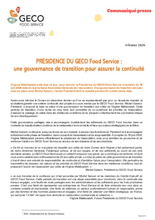 Après avoir informé le Comex en décembre dernier qu’il ne se représenterait pas pour un deuxième mandat, et souhaitant garantir une entière continuité des projets en cours menés par le GECO Food Service, Michel Sanson, Président, a proposé la mise en place d’une gouvernance de transition aux côtés de Virginie Malekzadeh. Cette période de transition, d’une durée de cinq mois, leur permettra de co-construire les priorités de l’association, d’assurer le passage de relais dans les meilleures conditions et de préparer collectivement les prochaines étapes de son développement.
