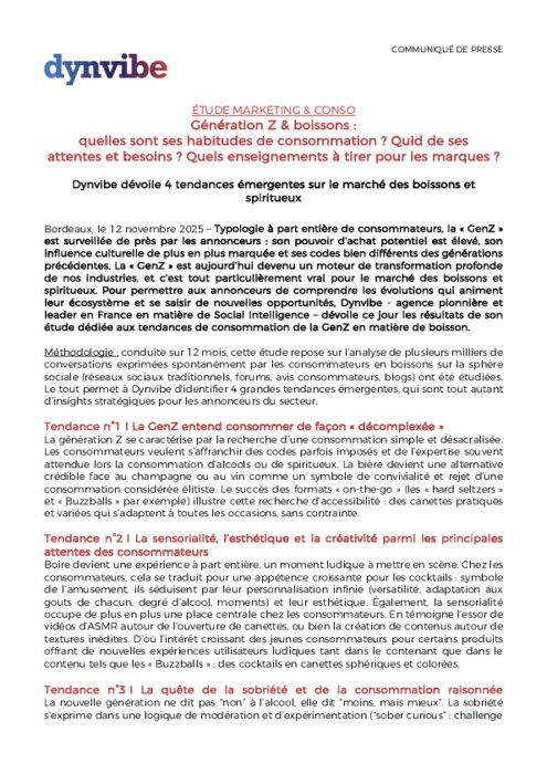 Typologie à part entière de consommateurs, la « GenZ » est surveillée de près par les annonceurs : son pouvoir d’achat potentiel est élevé, son influence culturelle de plus en plus marquée et ses codes bien différents des générations précédentes. La « GenZ » est aujourd’hui devenu un moteur de transformation profonde de nos industries, et c’est tout particulièrement vrai pour le marché des boissons et spiritueux. Pour permettre aux annonceurs de comprendre les évolutions qui animent leur écosystème et se saisir de nouvelles opportunités, Dynvibe - agence pionnière et leader en France en matière de Social Intelligence – dévoile ce jour les résultats de son étude dédiée aux tendances de consommation de la GenZ en matière de boisson.