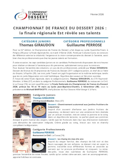 Pour sa 52e édition, le Championnat de France du Dessert a fait étape au Lycée Hyacinthe-Friant, à Poligny (39) pour la finale régionale Est, ce mardi 3 février . Porté par Cultures Sucre, ce concours de référence valorise la créativité, l’exigence et la vision contemporaine du dessert à l’assiette, aussi bien chez les professionnels que chez les jeunes talents en formation.