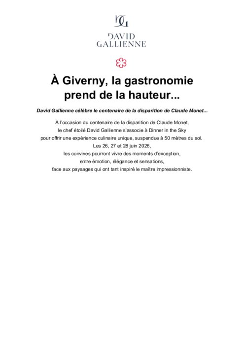 À l’occasion du centenaire de la disparition de Claude Monet, le chef étoilé David Gallienne s’associe à Dinner in the Sky pour offrir une expérience culinaire unique, suspendue à 50 mètres du sol. Les 26, 27 et 28 juin, les convives pourront vivre des moments d’exception, entre émotion, élégance et sensations, face aux paysages qui ont tant inspiré le maître impressionniste.