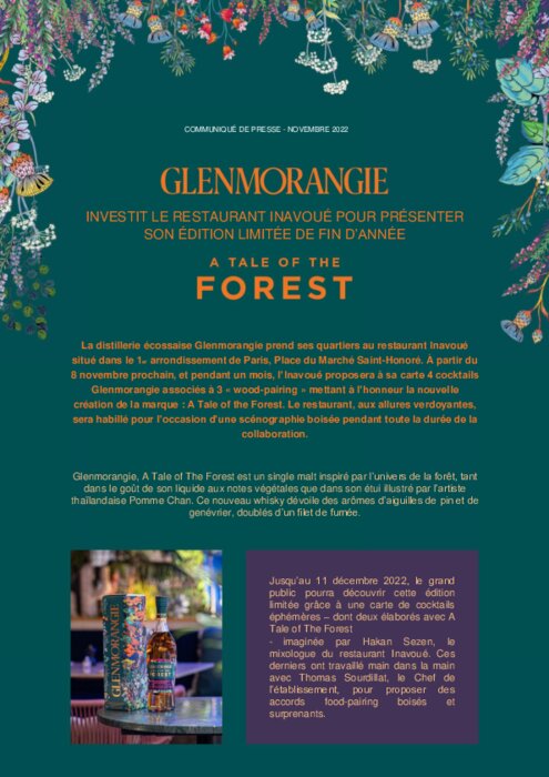 Jusqu’au 11 décembre , le grand public pourra découvrir l'édition limitée de la distillerie écossaise Glenmorangie A Tale Of The Forest grâce à une carte de cocktails éphémères imaginée par Hakan Sezen, le mixologue du restaurant Inavoué.