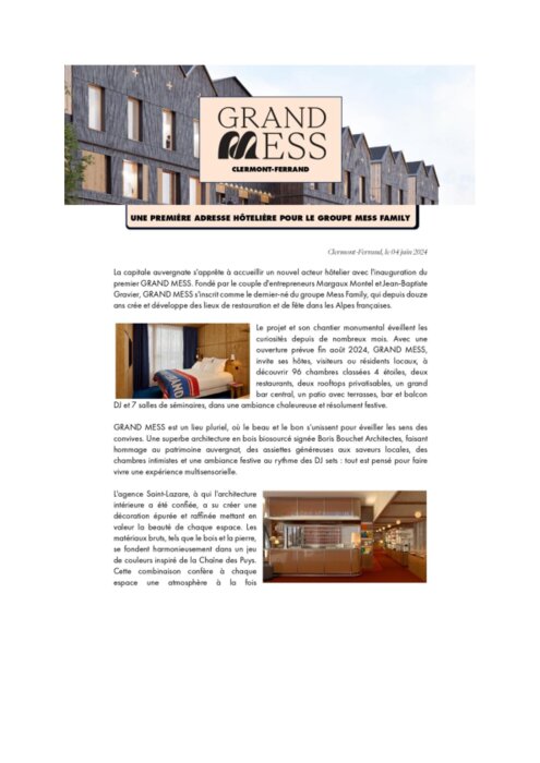 Restauration commerciale 06 juin 2024 - 15:52 Grand Mess Clermont-Ferrand dépasse largement sa simple définition d'hôtel avec deux restaurants. C'est une expérience en soi, où l'on se sent chez soi tout en étant continuellement surpris. PDF (550 Ko) Télécharger
