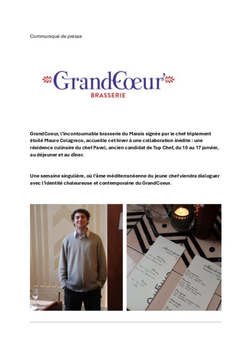 GrandCoeur, l’incontournable brasserie du Marais signée par le chef triplement étoilé Mauro Colagreco, accueille cet hiver une collaboration inédite : une résidence culinaire du chef Pavel, ancien candidat de Top Chef, du 10 au 17 janvier, au déjeuner et au dîner.