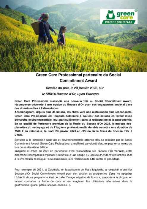Fournisseurs 16 décembre 2022 - 15:07 Green Care Professional s’associe une nouvelle fois au Social Commitment Award, récompense décernée à une équipe du Bocuse d’Or pour son engagement sociétal dans des domaines liés à l’alimentation. PDF (406 Ko) Télécharger