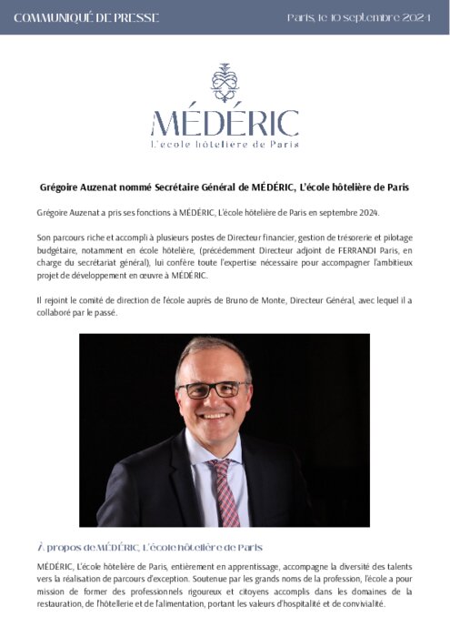 Son parcours riche et accompli à plusieurs postes de Directeur financier, gestion de trésorerie et pilotage budgétaire, notamment en école hôtelière, (précédemment Directeur adjoint de Ferrandi Paris, en charge du secrétariat général), lui confère toute l’expertise nécessaire pour accompagner l’ambitieux projet de développement en œuvre à Médéric.