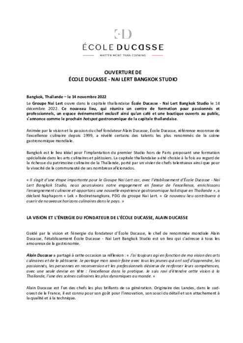 Le Groupe Nai Lert ouvre dans la capitale thaïlandaise École Ducasse