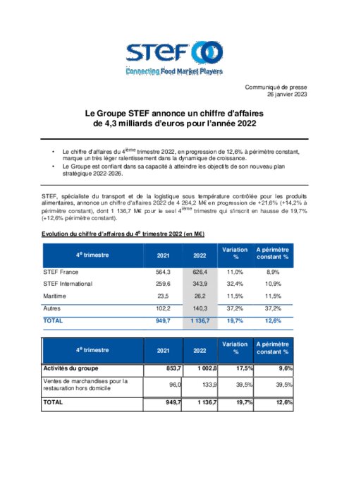 Fournisseurs 26 janvier 2023 - 17:50 STEF, spécialiste du transport et de la logistique sous température contrôlée pour les produits alimentaires, annonce un chiffre d'affaires 2022 de 4 264,2 M€ en progression de +21,6% . PDF (154 Ko) Télécharger