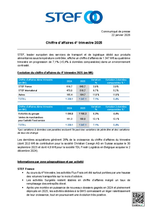 STEF, leader européen des services de transport et de logistique dédié aux produits alimentaires sous température contrôlée, affiche un chiffre d’affaires de 1 347 M€ au quatrième trimestre en progression de 7,1% (+5,4% à données comparables) dans un environnement contrasté.