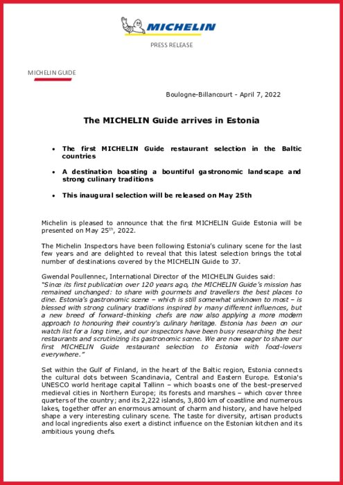 Michelin a le plaisir d’annoncer l’arrivée du Guide MICHELIN en Estonie, dont la première sélection de restaurants sera présentée le 25 mai 2022. Les inspecteurs Michelin suivent la scène culinaire de l'Estonie depuis quelques années et sont ravis d’annoncer que ce dernier ajout porte à 37 le nombre total de destinations couvertes par le Guide MICHELIN.