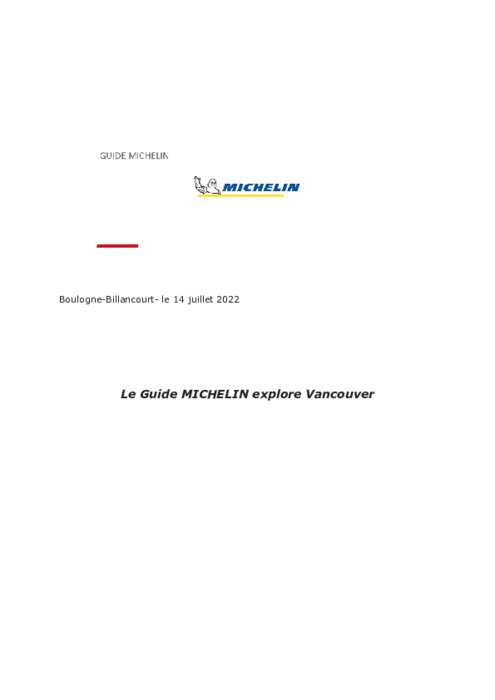 Métiers 14 juillet 2022 - 20:26 Michelin et Destination Vancouver annoncent le lancement du Guide MICHELIN® Vancouver, la nouvelle sélection du Guide MICHELIN. PDF (183 Ko) Télécharger