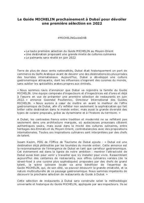Le Guide MICHELIN prochainement à Dubaï pour dévoiler une première sélection en 2022