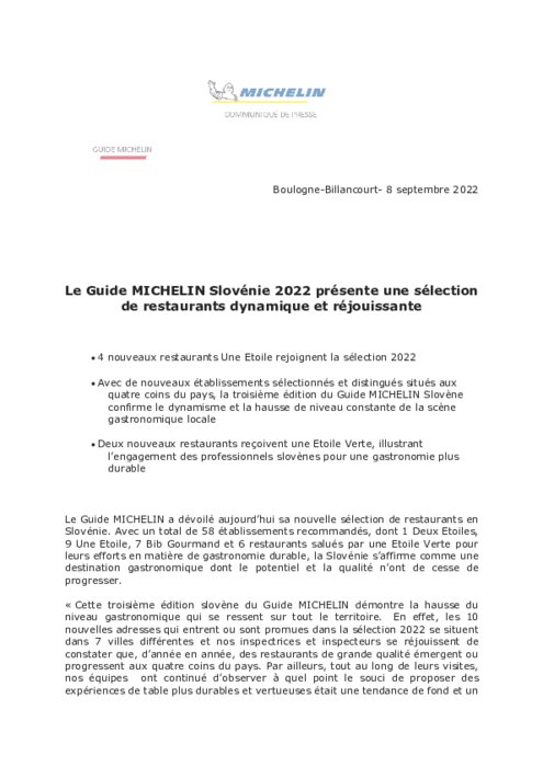 Le Guide MICHELIN a dévoilé aujourd’hui sa nouvelle sélection de restaurants en Slovénie. Avec un total de 58 établissements recommandés, dont 1 Deux Etoiles, 9 Une Etoile, 7 Bib Gourmand et 6 restaurants salués par une Etoile Verte pour leurs efforts en matière de gastronomie durable, la Slovénie s’affirme comme une destination gastronomique dont le potentiel et la qualité n’ont de cesse de progresser.