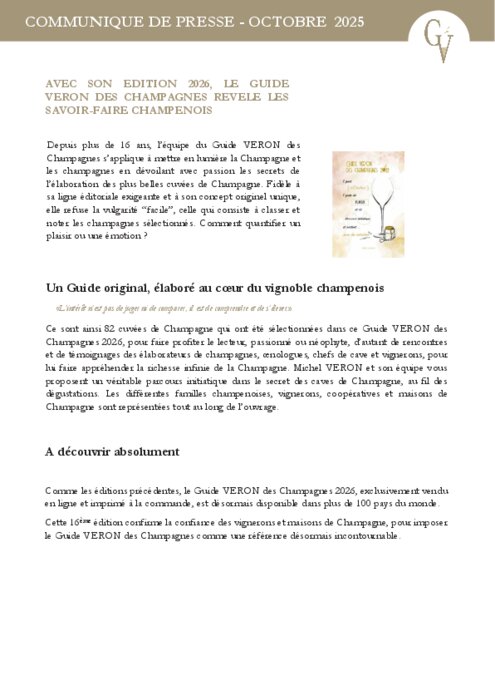 Ce sont ainsi 82 cuvées de Champagne qui ont été sélectionnées dans ce Guide Veron des Champagnes 2026, pour faire profiter le lecteur, passionné ou néophyte, d’autant de rencontres et de témoignages des élaborateurs de champagnes, œnologues, chefs de cave et vignerons, pour lui faire appréhender la richesse infinie de la Champagne. Michel Veron et son équipe vous proposent un véritable parcours initiatique dans le secret des caves de Champagne, au fil des dégustations. Les différentes familles champenoises, vignerons, coopératives et maisons de Champagne sont représentées tout au long de l’ouvrage.
