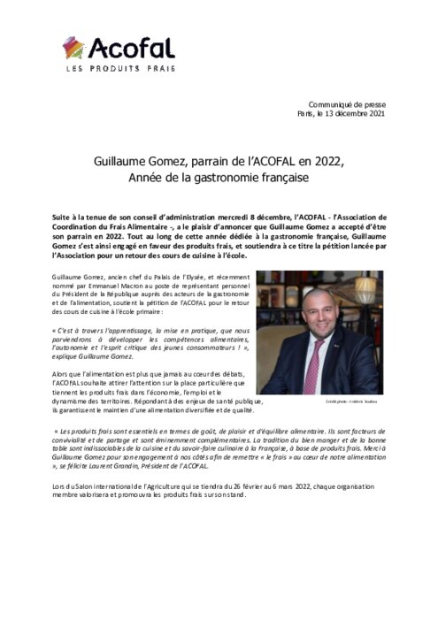 Suite à la tenue de son conseil d'administration mercredi 8 décembre, l'ACOFAL - l'Association de Coordination du Frais Alimentaire -, a le plaisir d'annoncer que Guillaume Gomez a accepté d'être son parrain en 2022. Tout au long de cette année dédiée à la gastronomie française, Guillaume Gomez s'est ainsi engagé en faveur des produits frais, et soutiendra à ce titre la pétition lancée par l'Association pour un retour des cours de cuisine à l'école.