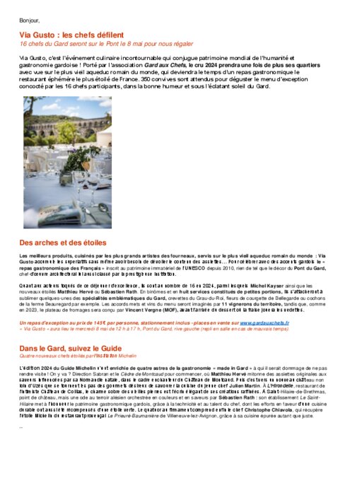 Via Gusto, c’est l’événement culinaire incontournable qui conjugue patrimoine mondial de l’humanité et gastronomie gardoise ! Porté par l’association Gard aux Chefs, le cru 2024 prendra une fois de plus ses quartiers avec vue sur le plus vieil aqueduc romain du monde, qui deviendra le temps d’un repas gastronomique le restaurant éphémère le plus étoilé de France. 350 convives sont attendus pour déguster le menu d’exception concocté par les 16 chefs participants, dans la bonne humeur et sous l’éclatant soleil du Gard.