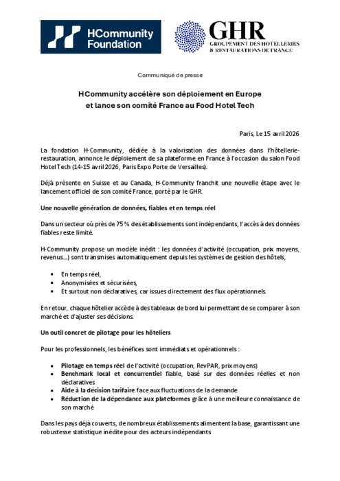 La fondation H-Community, dédiée à la valorisation des données dans l’hôtellerie-restauration, a annoncé le déploiement de sa plateforme en France à l’occasion du récent salon Food Hotel Tech. Déjà présente en Suisse et au Canada, H-Community franchit une nouvelle étape avec le lancement officiel de son comité France, porté par le GHR.