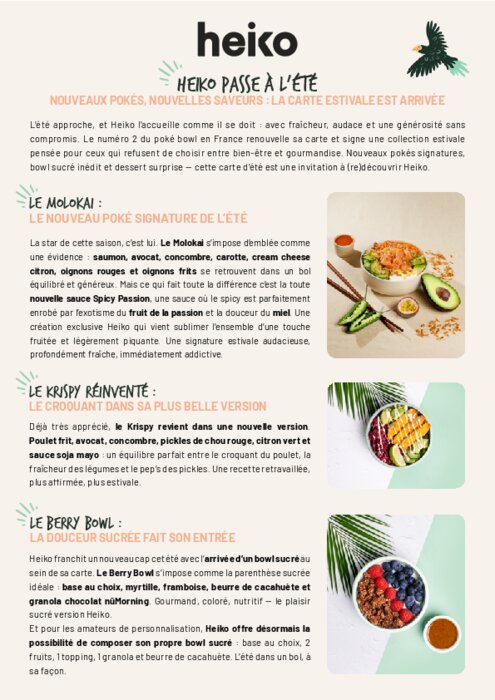 L'été approche, et Heiko l'accueille comme il se doit : avec fraîcheur, audace et une générosité sans compromis. Le numéro 2 du poké bowl en France renouvelle sa carte et signe une collection estivale pensée pour ceux qui refusent de choisir entre bien-être et gourmandise. Nouveaux pokés signatures, bowl sucré inédit et dessert surprise — cette carte d'été est une invitation à (re)découvrir Heiko.