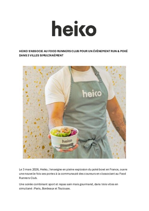 Snacking 26 février 2026 - 09:55 Le 3 mars, Heiko, l'enseigne en pleine explosion du poké bowl en France, ouvre une nouvelle fois ses portes à la communauté des coureurs en s'associant au Food Runners Club. PDF (172 Ko) Télécharger credit Heiko