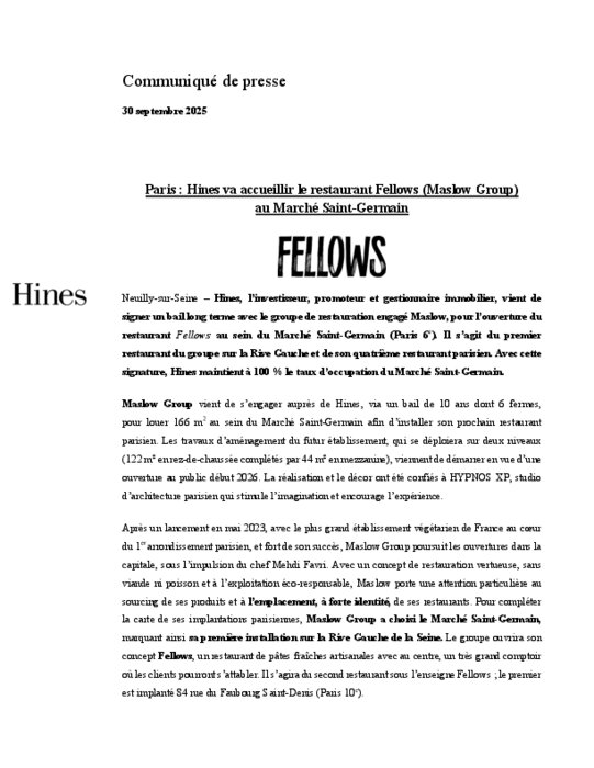 Hines, l’investisseur, promoteur et gestionnaire immobilier, vient de signer un bail long terme avec le groupe de restauration engagé Maslow, pour l’ouverture du restaurant Fellows au sein du Marché Saint-Germain (Paris 6e). Il s’agit du premier restaurant du groupe sur la Rive Gauche et de son quatrième restaurant parisien. Avec cette