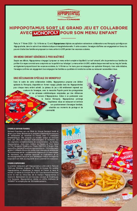 Depuis ses débuts, Hippopotamus s’engage à proposer un menu enfant complet et équilibré à un tarif attractif, afin de permettre aux familles de profiter d’un repas convivial sans compromis sur la qualité ni sur le budget. Le menu enfant à 4,90€, valable chaque mercredi tout au long de l’année, est également proposé durant les vacances scolaires, du 14 février au 1er mars, pour accompagner son opération Monopoly. Avec cette initiative, l’enseigne confirme son engagement à accompagner les familles au quotidien et à rendre les sorties au restaurant accessibles à tous.