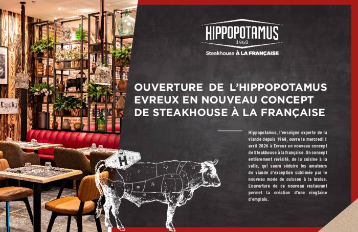 Hippopotamus, l’enseigne experte de la viande depuis 1968, ouvre le mercredi 1er avril à Evreux en nouveau concept de Steakhouse à la française. Un concept entièrement revisité, de la cuisine à la salle, qui saura séduire les amateurs de viande d’exception sublimée par le nouveau mode de cuisson à la braise. L’ouverture de ce nouveau restaurant permet la création d’une vingtaine d’emplois.