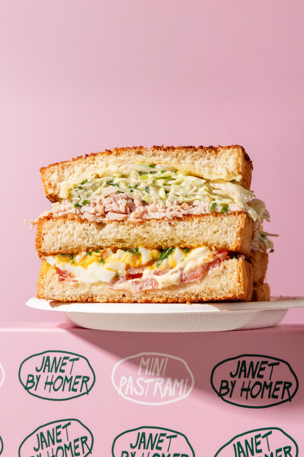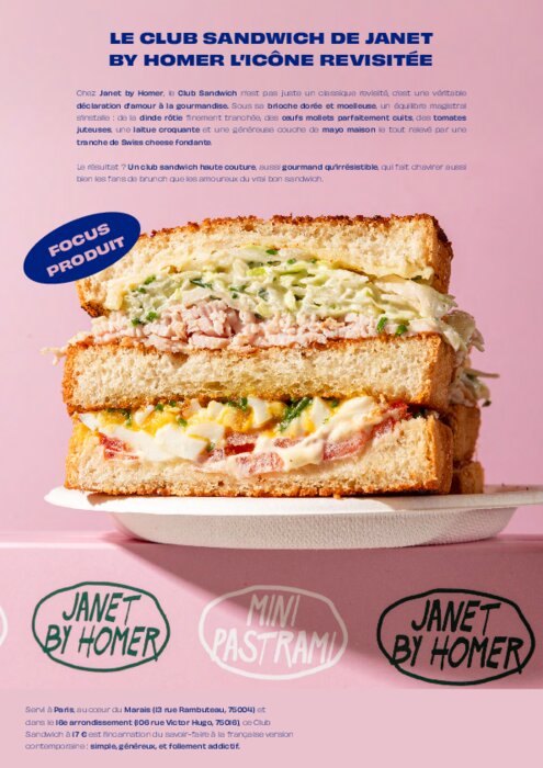 Chez Janet by Homer, le Club Sandwich n’est pas juste un classique revisité, c’est une véritable déclaration d’amour à la gourmandise. Sous sa brioche dorée et moelleuse, un équilibre magistral s’installe : de la dinde rôtie finement tranchée, des œufs mollets parfaitement cuits, des tomates juteuses, une laitue croquante et une généreuse couche de mayo maison le tout relevé par une tranche de Swiss cheese fondante.