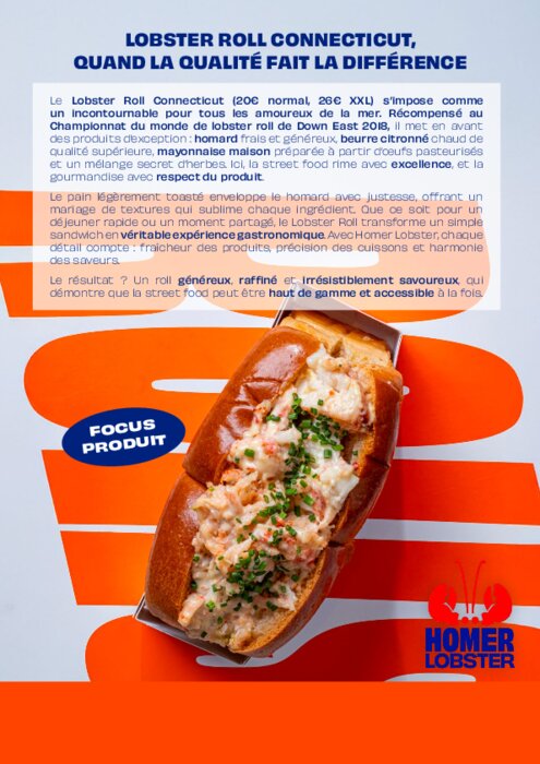 Le Lobster Roll Connecticut (20€ normal, 26€ XXL) s’impose comme un incontournable pour tous les amoureux de la mer. Récompensé au Championnat du monde de lobster roll de Down East 2018, il met en avant des produits d’exception : homard frais et généreux, beurre citronné chaud de qualité supérieure, mayonnaise maison préparée à partir d’œufs pasteurisés et un mélange secret d’herbes. Ici, la street food rime avec excellence, et la gourmandise avec respect du produit.