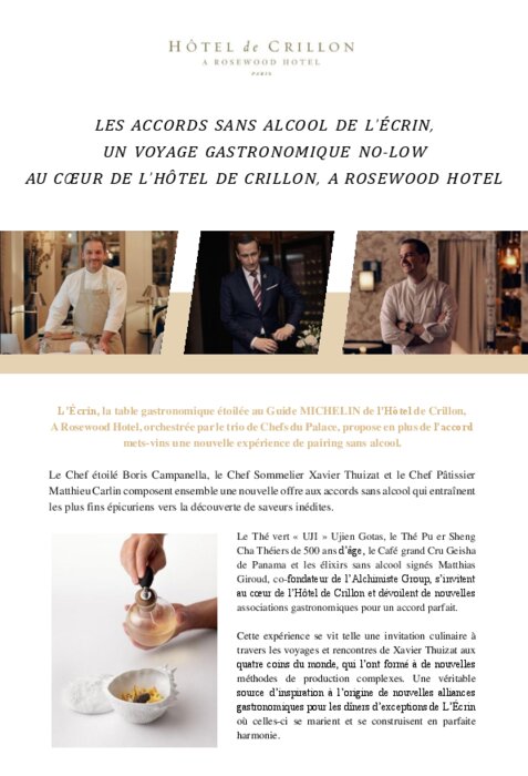 L’Écrin, la table gastronomique étoilée au Guide Michelin de l’Hôtel de Crillon, A Rosewood Hotel, orchestrée par le trio de Chefs du Palace, propose en plus de l’accord mets-vins une nouvelle expérience de pairing sans alcool. Le Chef étoilé Boris Campanella, le Chef Sommelier Xavier Thuizat et le Chef Pâtissier Matthieu Carlin composent ensemble une nouvelle offre aux accords sans alcool qui entraînent les plus fins épicuriens vers la découverte de saveurs inédites.