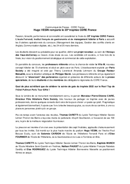Passion, ténacité, performance et convivialité ont caractérisé la finale du 20e trophée CDRE France. L’école Ferrandi, institut français de gastronomie et de management hôtelier à Paris a accueilli les 9 ateliers opérationnels du concours (Management des équipes, Gestion des conflits clients en Anglais, Communication digitale, etc.), les 24 et 25 mars derniers.