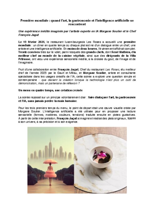 Le 19 février, le restaurant luxembourgeois Les Roses a accueilli une première mondiale : un dîner en quatre temps où chaque plat est né d’un dialogue entre un chef, une artiste et une intelligence artificielle. En moins de deux heures, l’événement affichait complet. Trente convives triés sur le volet, parmi lesquels des grands chefs, dont René Mathieu, élu meilleur chef au monde de la cuisine végétale, ainsi que des dirigeants de la Villa Pétrusse, ont vécu une expérience sensorielle inédite, à la croisée du goût, de l’image et de l’imaginaire.
