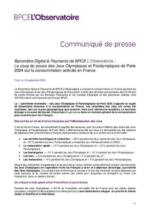 Impact des JO sur la consommation estivale en France (Baromètre Digital & Payments de BPCE L’Observatoire)