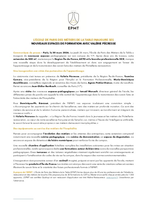 Le jeudi 26 mars, l’École de Paris des Métiers de la Table a inauguré de nouveaux espaces pédagogiques sur son campus du 17ᵉ. Après deux ans de travaux, cette extension de 500 m², soutenue par la Région Île-de-France, Akto et la branche professionnelle HCR, marque une nouvelle étape dans le développement de l’établissement et dans son engagement en faveur de l’apprentissage et de la transmission des savoir-faire des métiers de l’hôtellerie-restauration.
