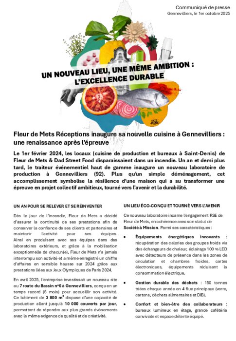 Le 1er février 2024, les locaux (cuisine de production et bureaux à Saint-Denis) de Fleur de Mets et Dad Street Food disparaissaient dans un incendie. Un an et demi plus tard, le traiteur événementiel haut de gamme inaugure un nouveau laboratoire de production à Gennevilliers (92). Plus qu’un simple déménagement, cet accomplissement symbolise la résilience d’une maison qui a su transformer une épreuve en un projet collectif ambitieux, tourné vers l’avenir et la durabilité.