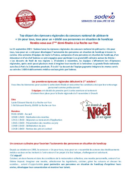 Métiers 30 septembre 2021 - 08:51 Sodexo lance les épreuves régionales du concours national de pâtisserie "Un pour tous, tous pour un" . PDF (273 Ko) Télécharger