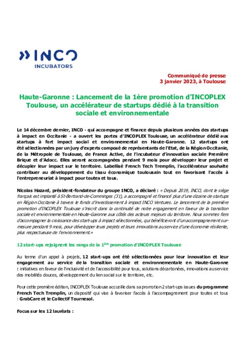Le 14 décembre dernier, INCO - qui accompagne et finance depuis plusieurs années des startups à impact en Occitanie - a ouvert les portes d’INCOPLEX Toulouse, un accélérateur dédié aux startups à fort impact social et environnemental en Haute-Garonne.