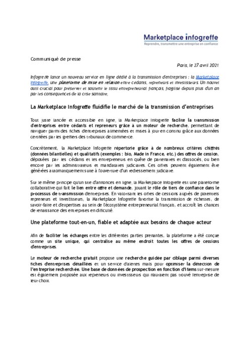 Fournisseurs, Métiers 07 juin 2021 - 08:59 La transmission d'entreprises du secteur de l'hôtellerie-restauration facilitée par Infogreffe : Marketplace Infogreffe, la plateforme web de mise en relation entre cédants, repreneurs, partenaires et investisseurs. PDF (228 Ko) Télécharger