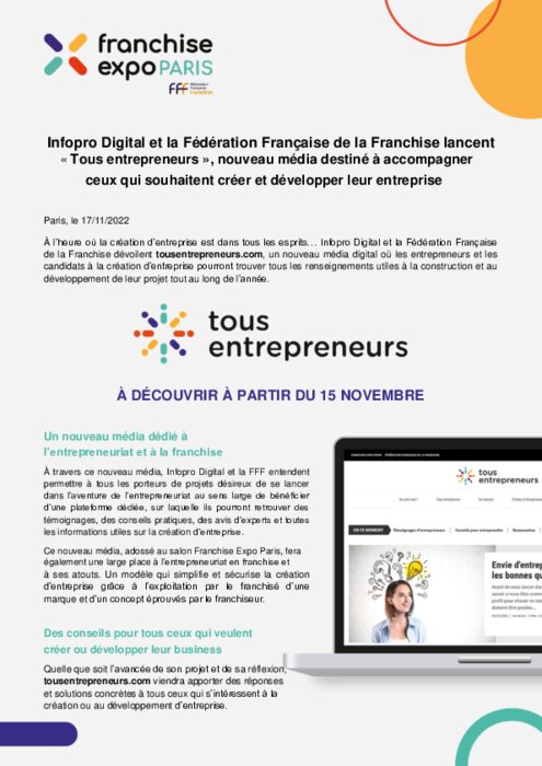 À l’heure où la création d’entreprise est dans tous les esprits, Infopro Digital et la Fédération Française de la Franchise dévoilent tousentrepreneurs.com, un nouveau média digital où les entrepreneurs et les candidats à la création d’entreprise pourront trouver tous les renseignements utiles à la construction et au développement de leur projet tout au long de l’année.