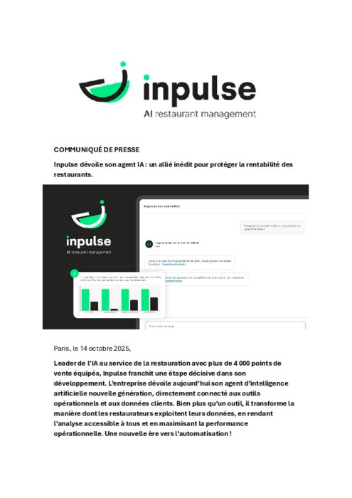 Leader de l’IA au service de la restauration avec plus de 4 000 points de vente équipés, Inpulse franchit une étape décisive dans son développement. L’entreprise dévoile aujourd’hui son agent d’intelligence artificielle nouvelle génération, directement connecté aux outils opérationnels et aux données clients. Bien plus qu’un outil, il transforme la manière dont les restaurateurs exploitent leurs données, en rendant l’analyse accessible à tous et en maximisant la performance opérationnelle. Une nouvelle ère vers l’automatisation .