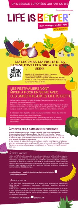 Métiers 20 juillet 2022 - 11:33 Un stand aux couleurs de la nouvelle campagne européenne "Life is Better avec les Légumes, les Fruits et la Banane" acceuillera les festivaliers tout au long du festival. PDF (527 Ko) Télécharger