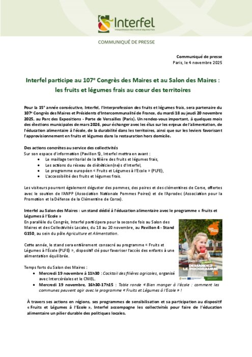 Pour la 15e année consécutive, Interfel, l’Interprofession des fruits et légumes frais, sera partenaire du 107e Congrès des Maires et Présidents d’Intercommunalité de France, du mardi 18 au jeudi 20 novembre 2025, au Parc des Expositions - Porte de Versailles (Paris). Un rendez-vous important, à quelques mois des élections municipales de mars 2026, pour échanger avec les élus sur les enjeux de l’alimentation, de l’éducation alimentaire à l’école, de la durabilité dans les territoires, ainsi que sur les leviers favorisant l’approvisionnement en fruits et légumes dans la restauration hors domicile.
