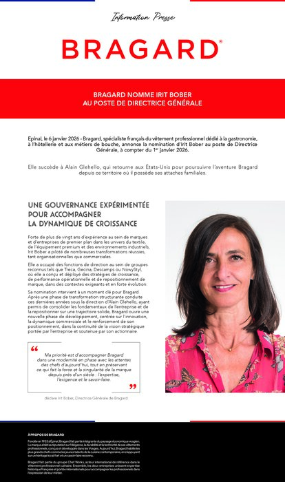 Fournisseurs 06 janvier 2026 - 11:19 Bragard, spécialiste français du vêtement professionnel dédié à la gastronomie, à l'hôtellerie et aux métiers de bouche, annonce la nomination d'Irit Boder au poste de directrice générale à partir du 1er janvier 2026. PDF (4 Mo) Télécharger