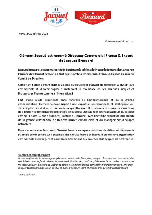 Fournisseurs 11 février 2026 - 11:50 Cette nomination s’inscrit dans la volonté du boulanger-pâtissier de renforcer sa dynamique commerciale et d’accompagner durablement la croissance de ses marques Jacquet et Brossard, en France comme à l’international. PDF (192 Ko) Télécharger credit Brossard